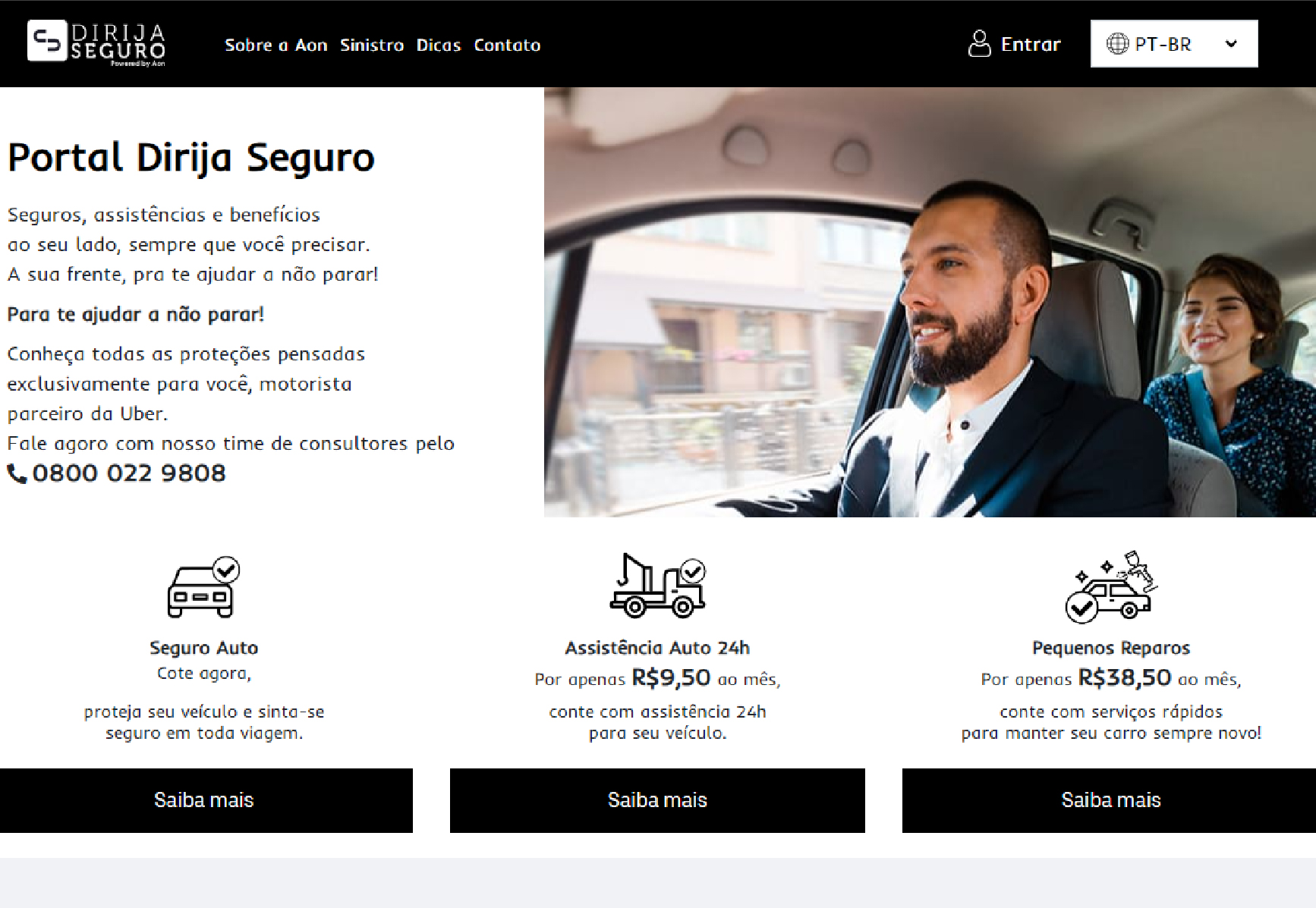 Portal de vendas de seguro auto para motoristas parceiros da Uber. Permite ao usuário cotar e contratar seguros personalizados conforme perfil e orçamento. Desenvolvido para garantir autonomia e praticidade ao motorista.